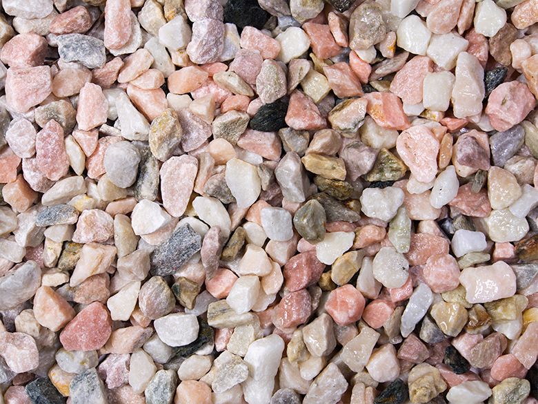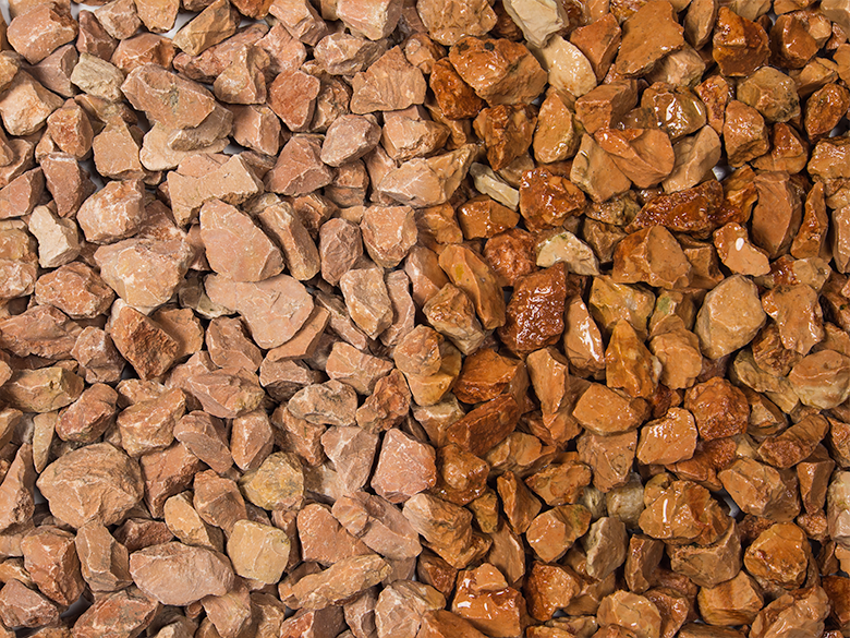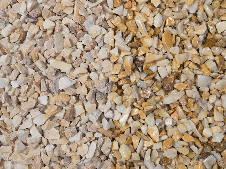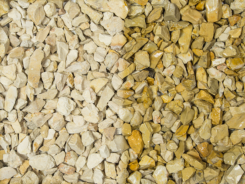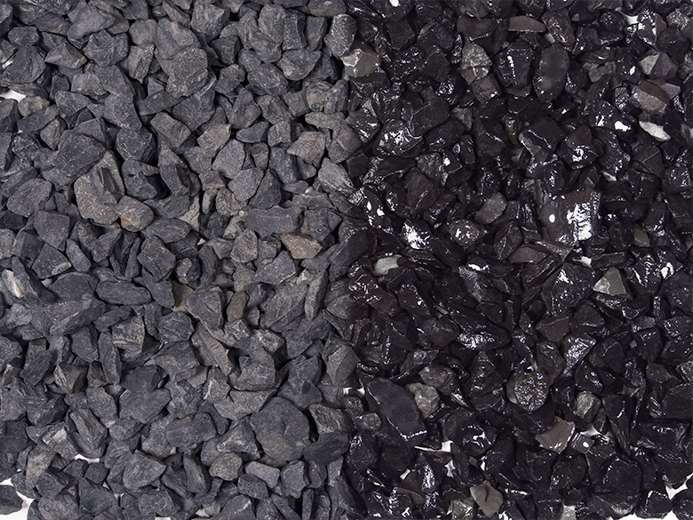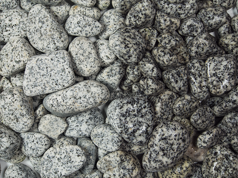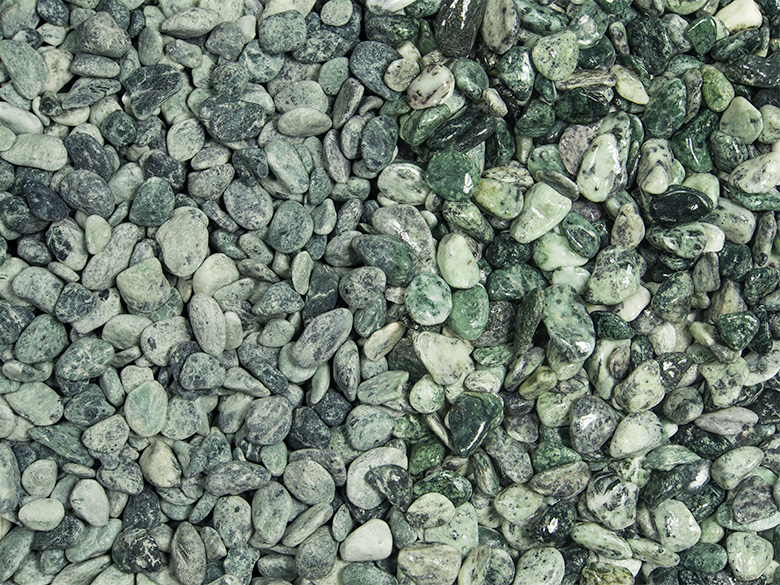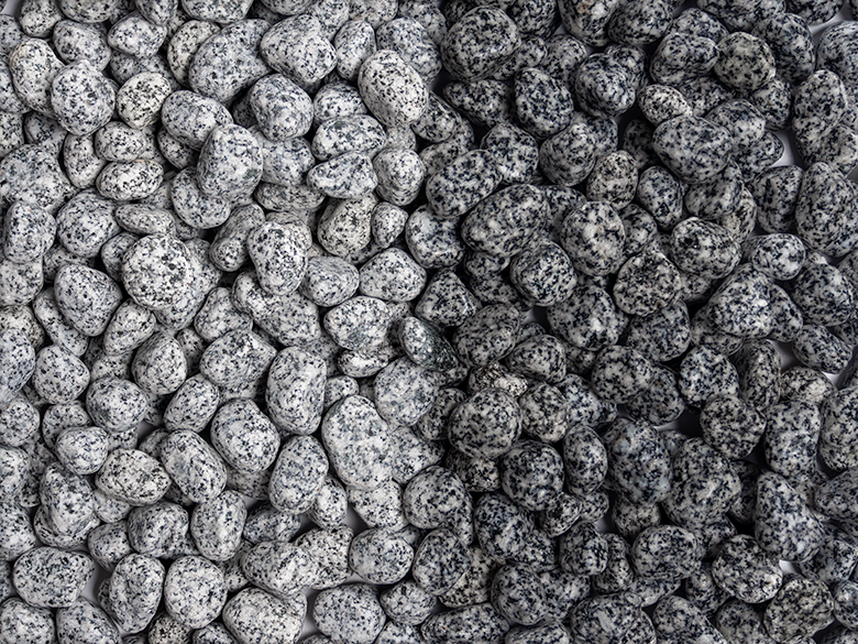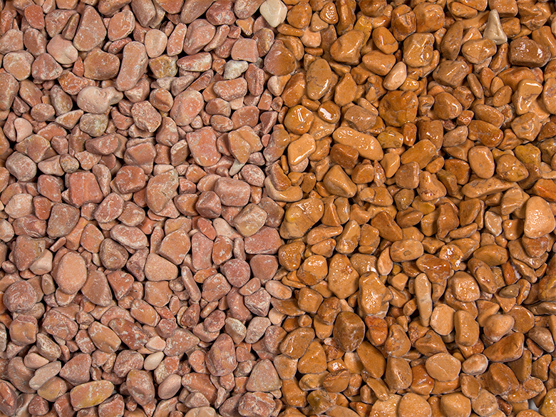 Steine mit einer feuchten Oberfläche wirken oft farbiger und kontrastreicher. Die hier abgebildeten Splitte und Kiese zeigen auf der rechten Bildseite immer den feuchten Stein.