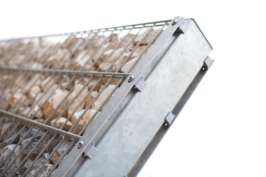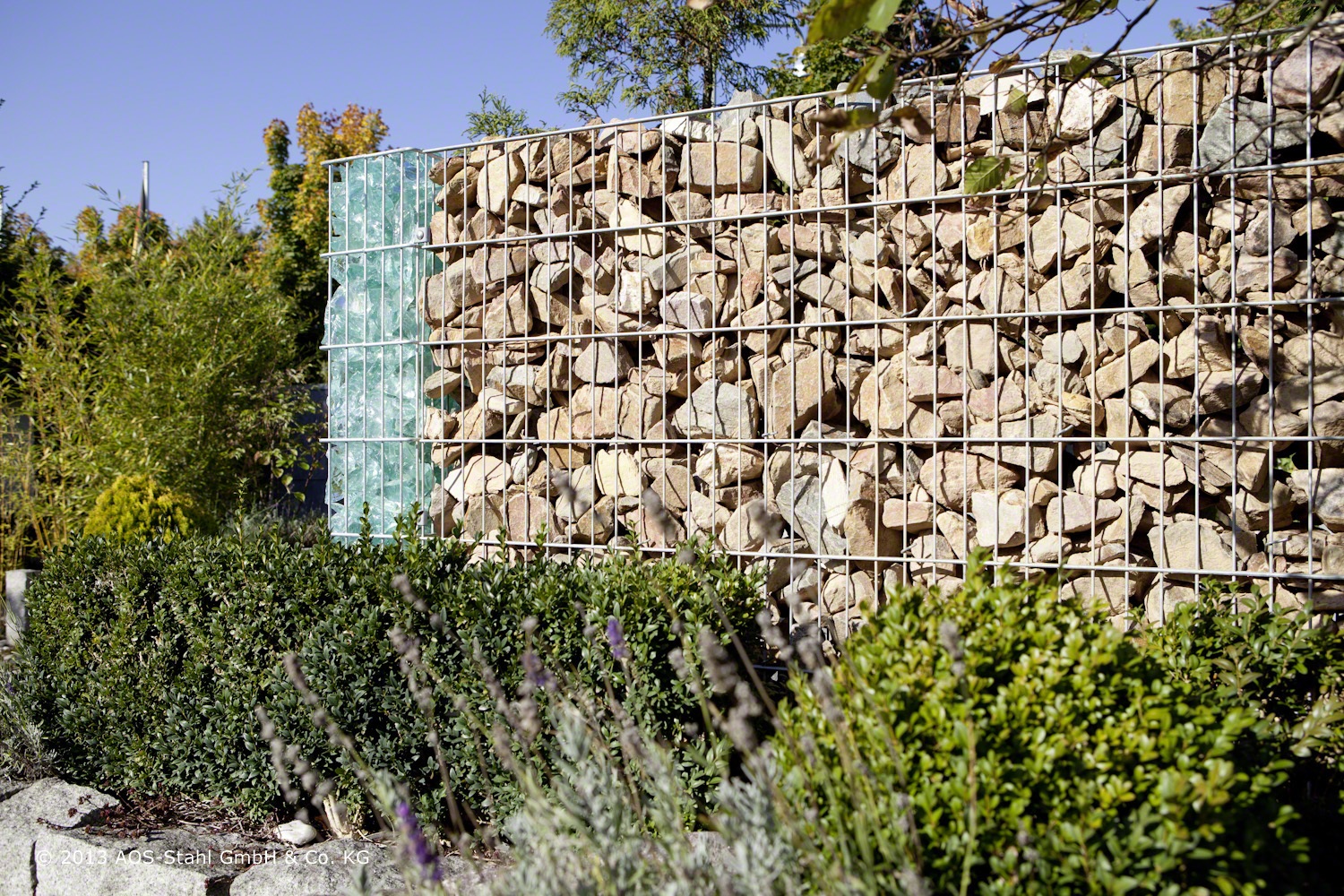 Größere Gabionen haben in der Regel eine Maschenweite von 50 mm oder 100 mm. Dementsprechend groß fällt auch die benötigte Füllung aus. Bedenken Sie bei der Planung Ihrer Gabione, dass Sie nicht zu große Steine in die Gabione füllen. Es sollten immer mehrere Steine hintereinander liegen können, damit keine "Löcher" entstehen durch die man hindurchsehen kann.